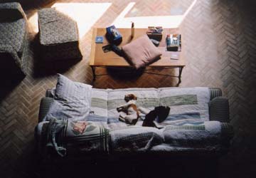 Here is a picture of Kitty and Lou playing. Kitty is the small dog, and Lou is the large cat. Cheryl's song Meow is about Lou.